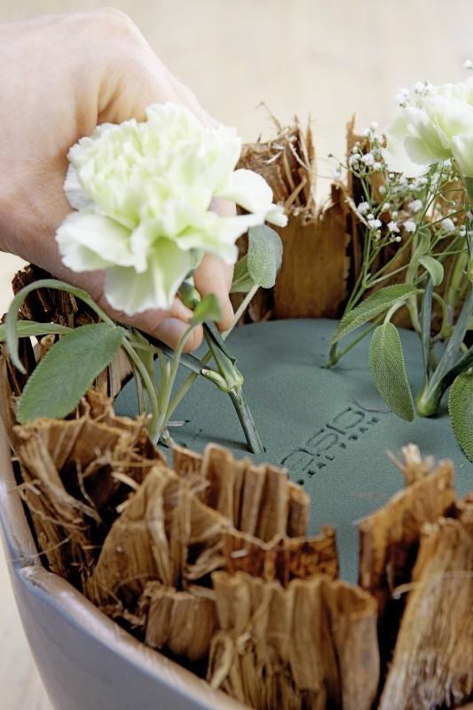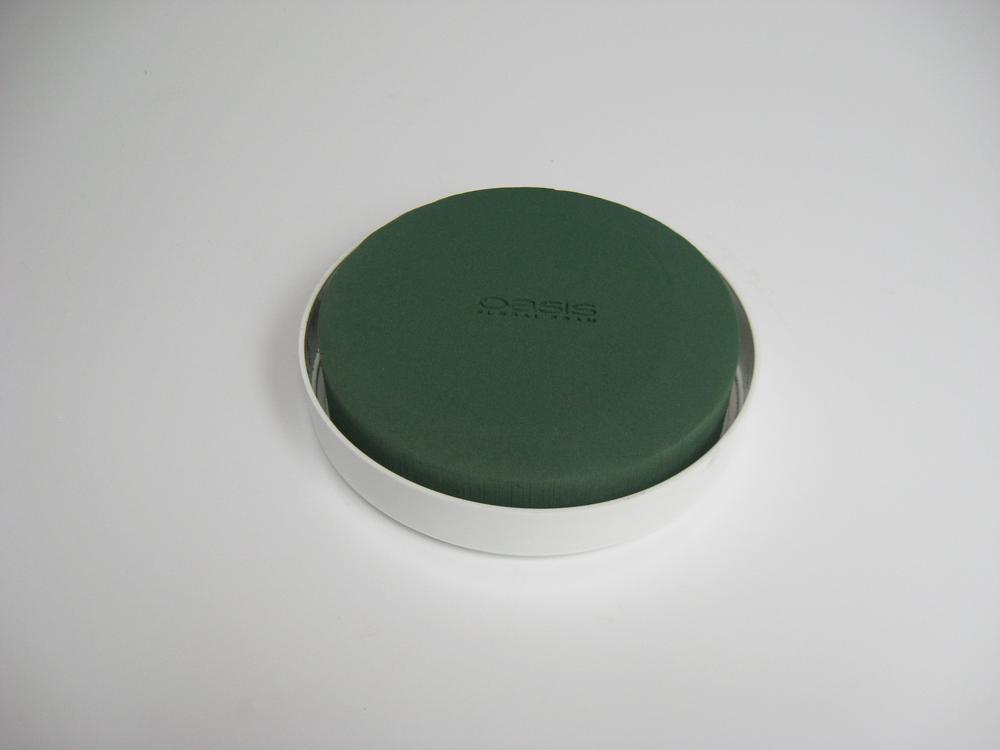 Aranžovací miska s hmotou určená pro stolní dekorace. Průměr misky 25 cm, výška 6 cm.
