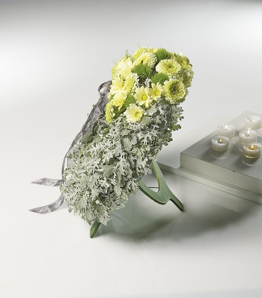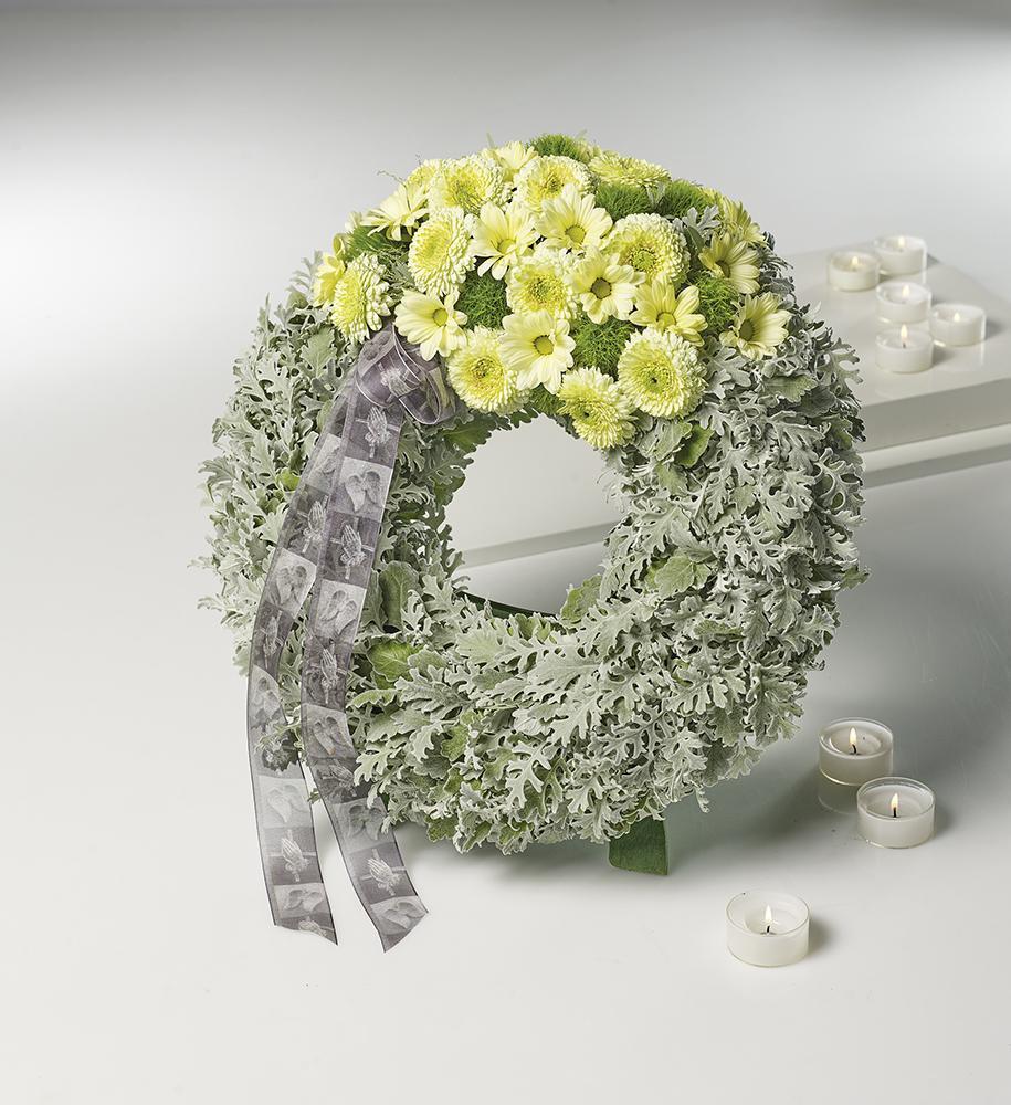 Věnec s dřevěným rozkládacím stojanem umožňujícím postavení do volného prostoru. Drátěná mřížka zabraňuje vylomení hmoty.Vnější Ø 52 cm, vnitřní Ø 31 cm.